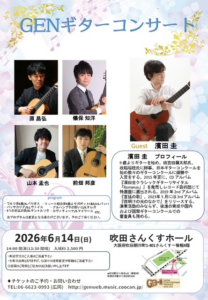 ギタリスト濱田圭氏をゲストに迎え、GENギターコンサートを開催いたします。古典から映画音楽まで様々な楽曲を演奏予定しております。 【開催日】2026年6月14日(日) 【時間】14:00開演(13:30開場) 【会場】吹 […]